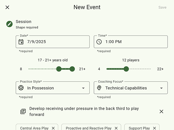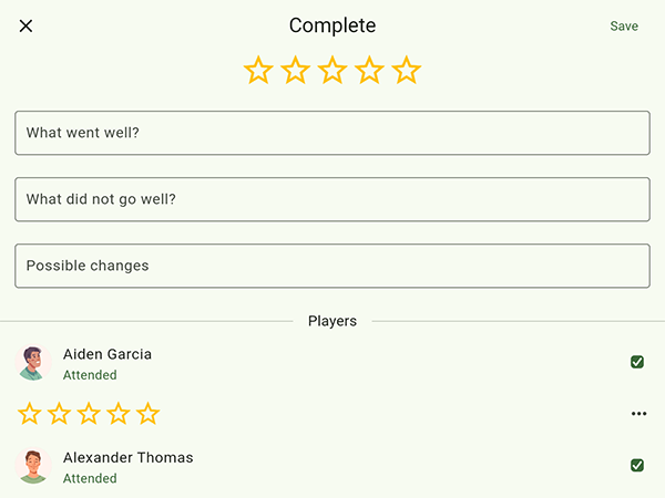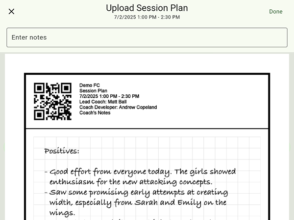 Notes taken during sessions can be uploaded to Coach Trevi to create comprehensive records which be used for future planning, performance analysis and sharing best practices.