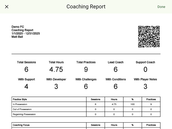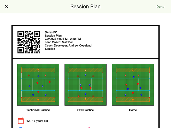 Coaches can view sessions online or print detailed session plans. These plans include space for recording observations and making adjustments, ensuring a smooth and effective training session.