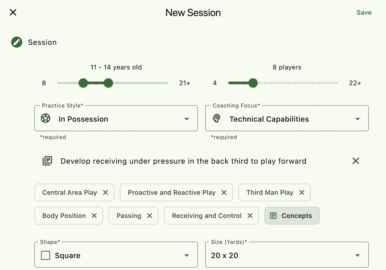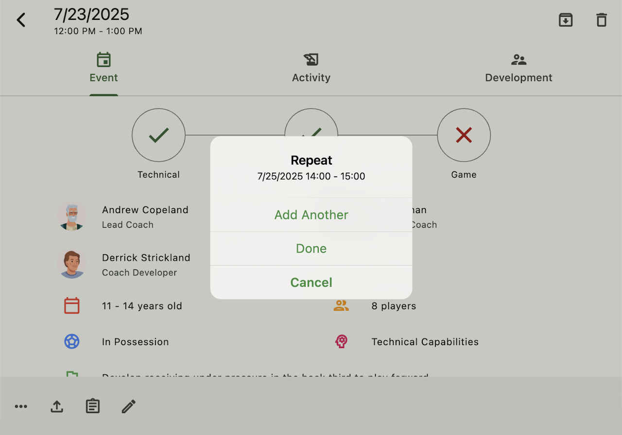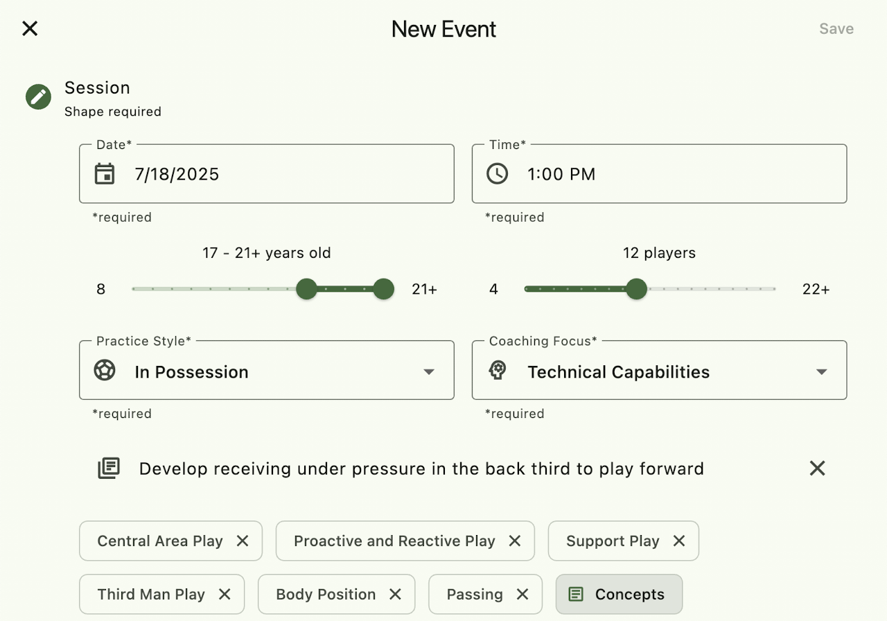 Save an event to sessions to revisit in later. This maintains the coaching setup while removing the event specific components such as players and date.