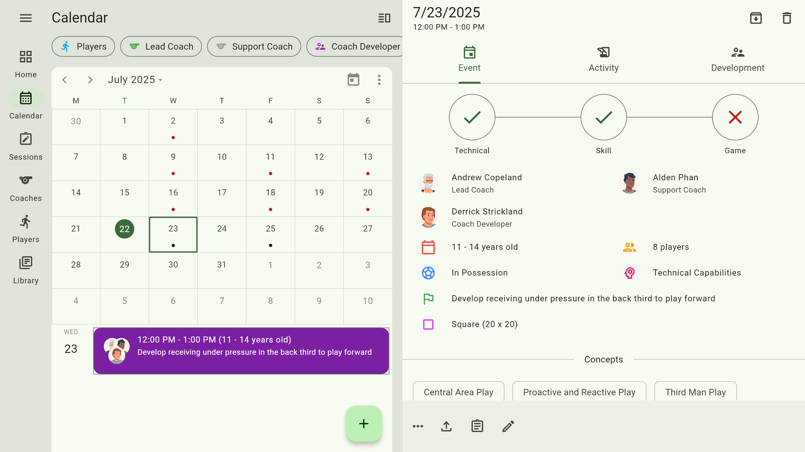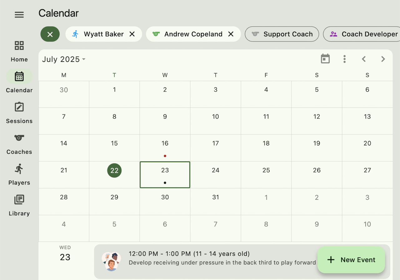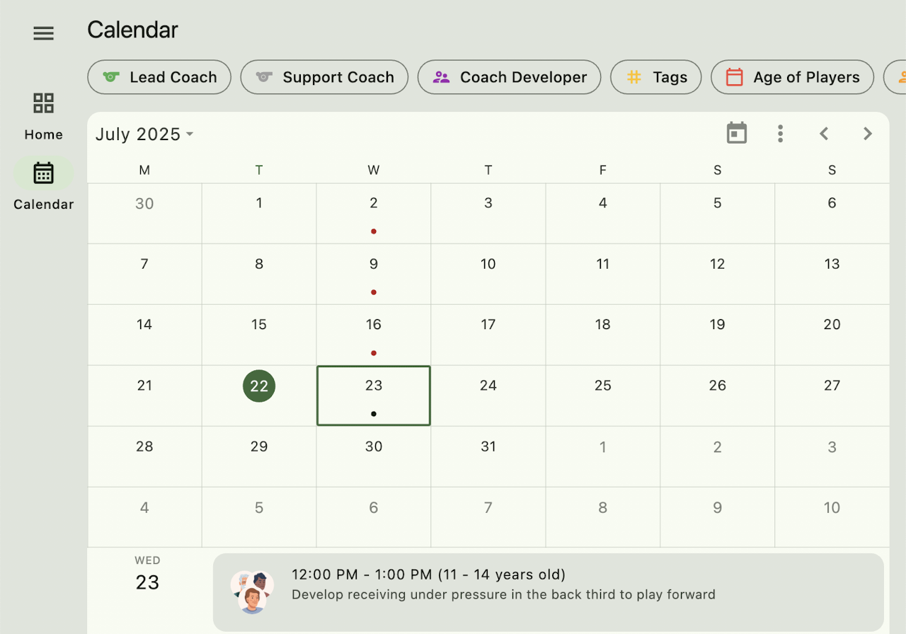 Schedule coaches, coach developers, and players in one intuitive calendar. Organize and oversee all team engagements from a single, convenient location.