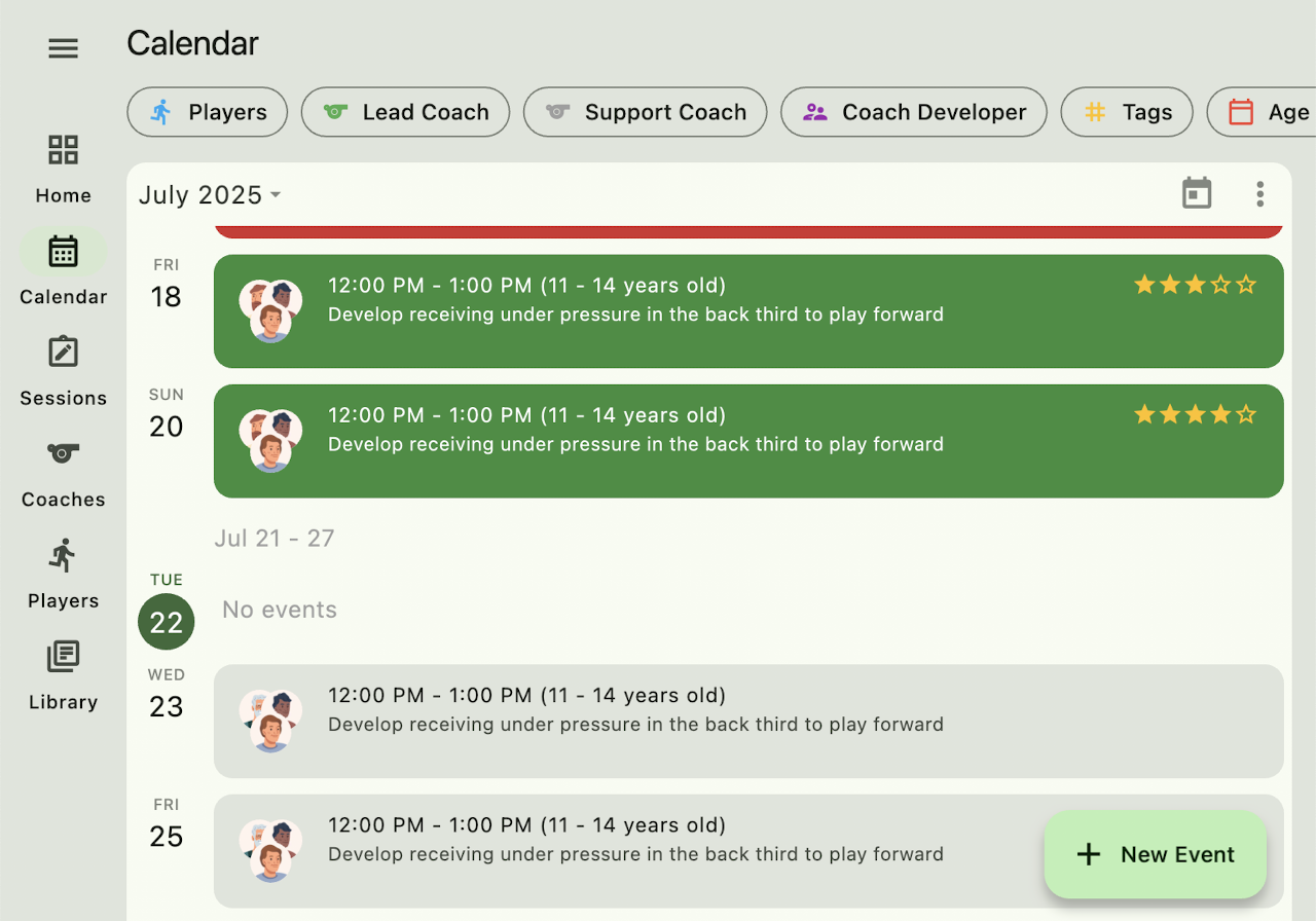 Filter by coaches, players and session components to instantly visualize events, optimize planning, and manage your schedule with unmatched precision.