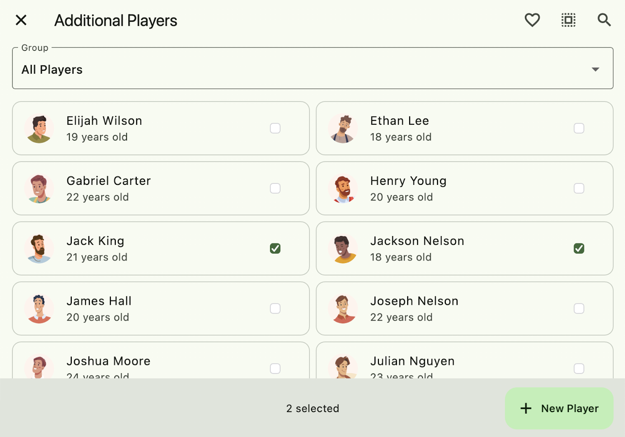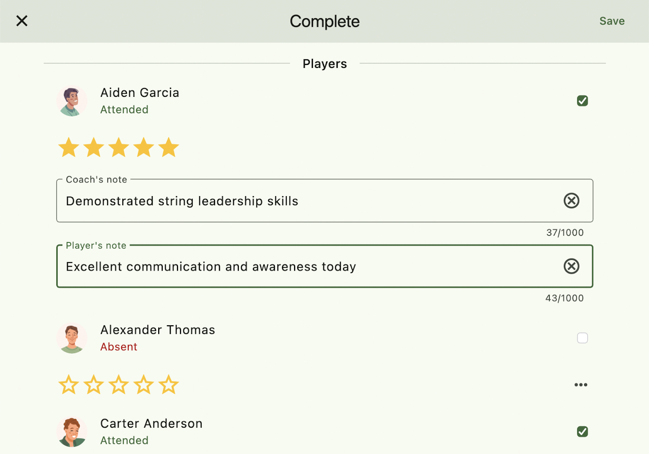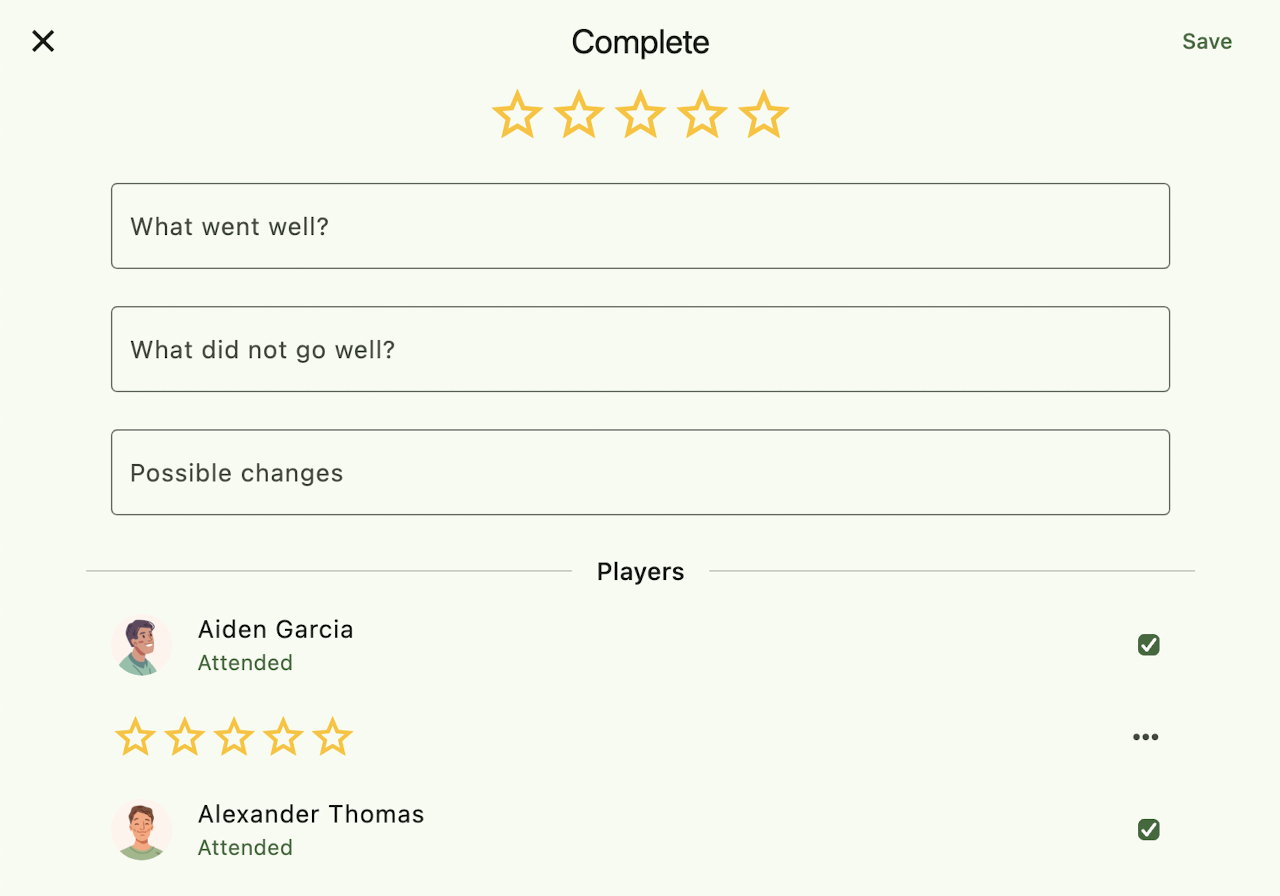 Coaches can add additional players who may have participated unexpectedly. Additional players can also have a rating, player’s notes and coaches note added.